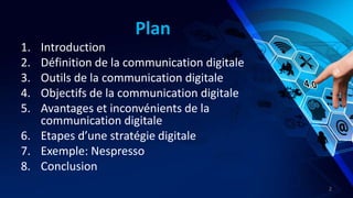 La communication digitale est cruciale pour les entreprises modernes, offrant des outils variés comme les blogs, les réseaux sociaux et la publicité en ligne pour accroître leur visibilité et interagir avec leurs clients. Bien qu'elle présente des avantages significatifs, tels que l'amélioration de la fidélisation et la gestion efficace des coûts, elle comporte également des inconvénients comme la surcharge d'information et des défis techniques. L'exemple de Nespresso illustre comment une entreprise peut tirer parti d'une stratégie digitale bien définie pour se rapprocher de ses clients et optimiser ses opérations.