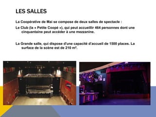 La coopérative de mai comprend deux salles de spectacle : le club, avec une capacité de 464 personnes et une mezzanine, et une grande salle de 1500 places. La scène mesure 210 m². Plusieurs artistes ont déjà interprété des spectacles dans ces salles.