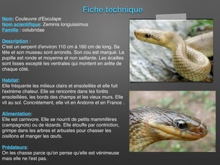 Le document présente des informations sur la couleuvre d'esculape, un serpent non venimeux vivant en France et Andorre, qui se nourrit de petits mammifères et de lézards. Il propose un plan d'action pour protéger cette espèce, comprenant des amendes pour chasse illégale, la protection de son habitat et des efforts de sensibilisation. Les auteurs soulignent l'importance de préserver cette espèce menacée par diverses menaces humaines.
