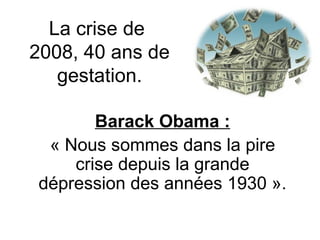 La crise de 2008 est le résultat d'une accumulation de facteurs économiques et politiques sur plusieurs décennies, notamment la dérégulation financière, la titrisation, et des pratiques de prêt imprudentes. La bulle du crédit, alimentée par des produits financiers complexes et une gestion des risques déficiente, a mené à des défauts massifs de paiement et à une perte de confiance dans le système bancaire. Ce phénomène a eu des répercussions mondiales, révélant les failles des réglementations et des politiques économiques en place.