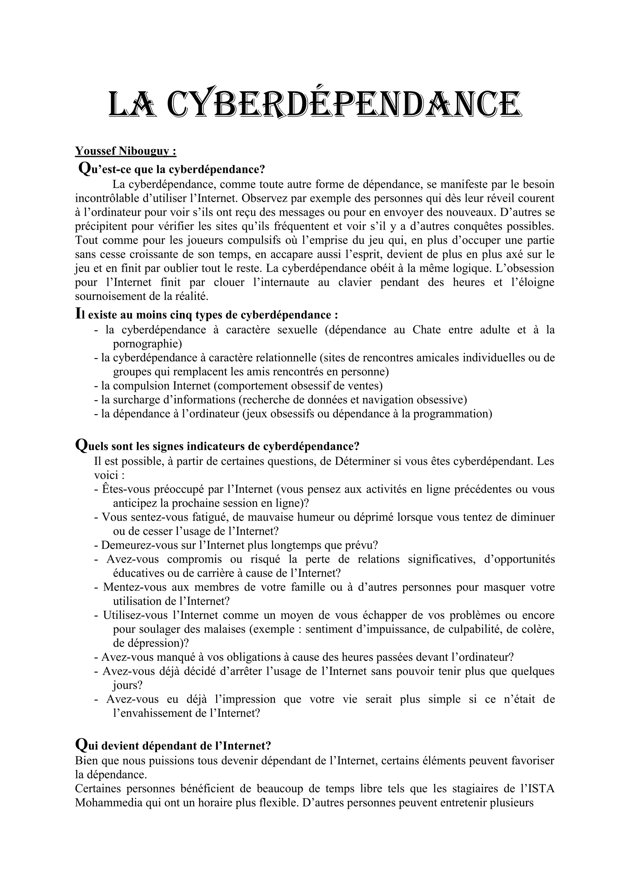 La cyberdépendance est une forme de dépendance caractérisée par un besoin incontrôlable d'utiliser Internet, entraînant l'isolement et la négligence des relations réelles. Elle se manifeste sous différentes formes, comme la dépendance aux jeux en ligne, aux relations virtuelles ou à la pornographie, et peut affecter principalement les jeunes. Des stratégies de rétablissement incluent la prise de conscience de l'usage d'Internet, l'établissement de limites, et la recherche de soutien dans le monde réel.