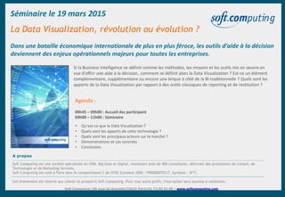 Le séminaire de Soft Computing, tenu le 19 mars 2015, aborde les enjeux de la data visualization dans le contexte de la business intelligence. Il explore les apports de cette technologie, ses principaux acteurs sur le marché, et propose des best practices pour le choix d'outils adaptés. Ce document fournit également des données sur l'importance croissante de la visualisation des données pour la prise de décision rapide et efficace.