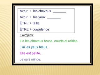 Le document présente des exercices sur l'utilisation des verbes 'être' et 'avoir' dans la description physique des personnes. Il fournit des exemples de descriptions physiques de différents individus, en soulignant leurs traits et apparences. Le texte invite également à identifier et à justifier le choix des verbes dans ces descriptions.