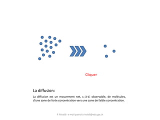 La diffusion est un mouvement net de molécules d'une zone de forte concentration vers une zone de faible concentration. Ce processus se termine lorsque l'équilibre dynamique est atteint, signifiant qu'il y a une égalité dans le déplacement des molécules dans les deux sens.