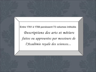En 1675, Colbert a demandé à l'Académie royale des sciences de créer une description détaillée des arts et métiers, conduisant à la publication de 73 volumes entre 1761 et 1788, qui ont influencé l'Encyclopédie de Diderot et d'Alembert. L'article sur la fabrication du papier, rédigé par Jérôme Le Français de la Lande, décrit le processus complexe, incluant le tri des chiffons, leur transformation en pâte, et la formation des feuilles de papier. Finalement, les feuilles passent par des étapes de collage et de séchage avant d'être lissées et triées pour s'assurer de leur qualité.