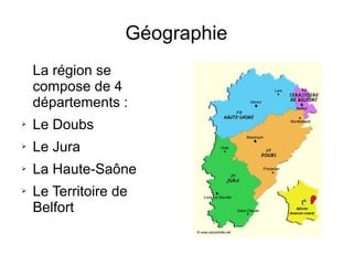 La Franche-Comté est une région française composée de quatre départements : Doubs, Jura, Haute-Saône et Territoire de Belfort, avec une population totale de 1 177 900 habitants. La région se distingue par ses montagnes du Jura et ses plaines, ainsi que par ses villes de petite et moyenne taille, dont Besançon est la plus peuplée. Elle est également reconnue pour son patrimoine culinaire, incluant des fromages, des vins du Jura, des plats cuisinés et de la charcuterie.