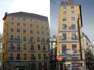 La fresque des Lyonnais est un trompe-l'œil de 800 mètres carrés, réalisée entre 1994 et 1995, présentant 24 personnages célèbres dont les frères Lumière et Antoine de Saint-Exupéry. Les frères Lumière ont contribué à l'histoire du cinéma, tandis que Saint-Exupéry, écrivain et aviateur, est l'auteur du célèbre livre 'Le Petit Prince'. Ce dernier, bien qu'illustre, a abandonné sa vocation de peintre, découragé par le manque de compréhension des 'grandes personnes' face à son art.
