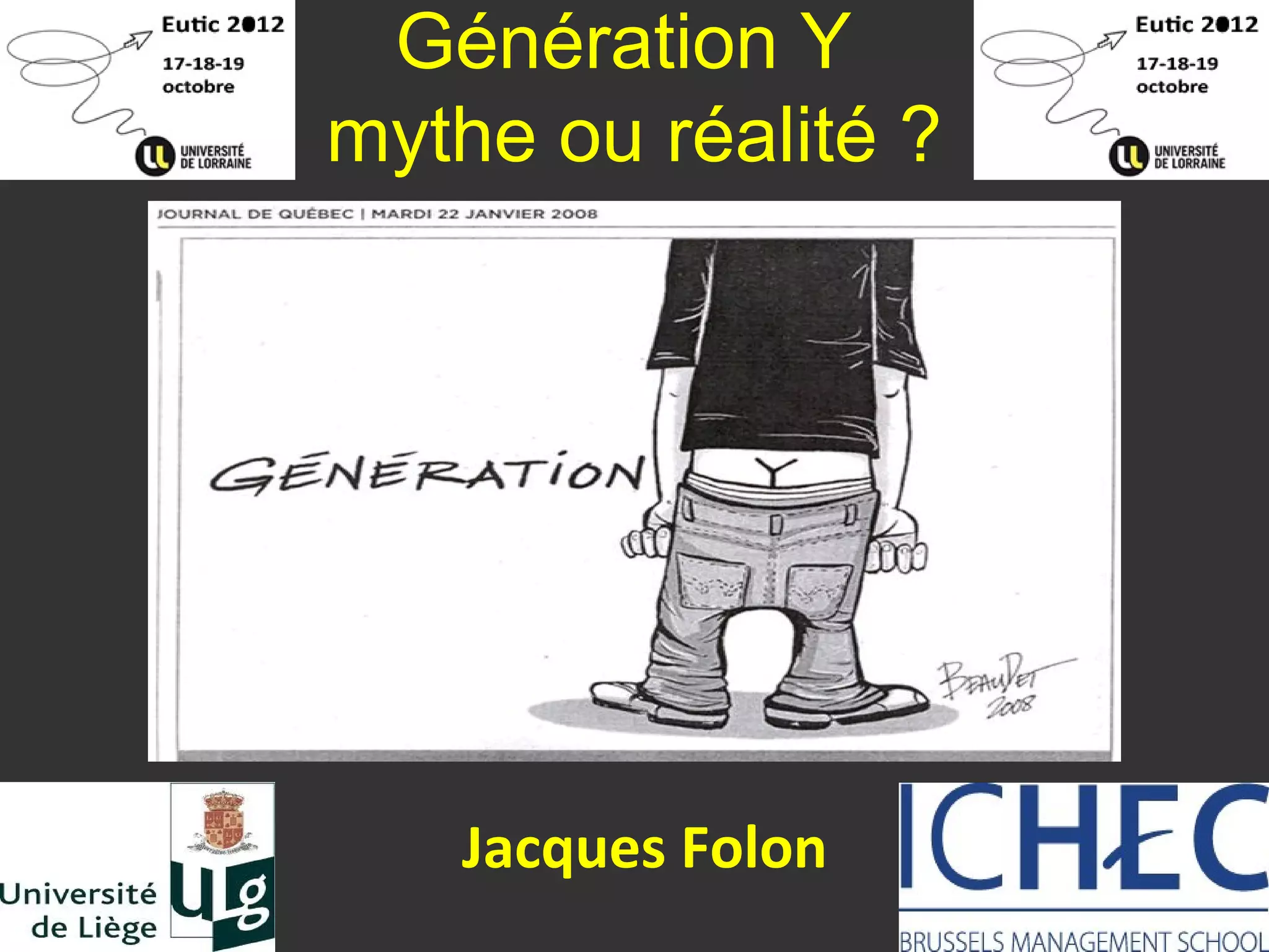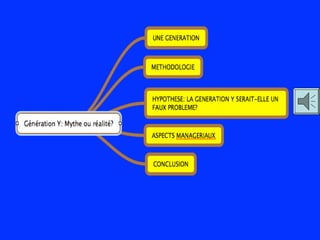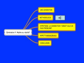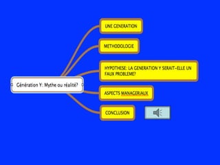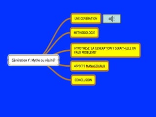 La présentation analyse la génération Y, questionnant l'existence et la définition de ce groupe aux caractéristiques souvent jugées peu rigoureuses. Elle évoque l'impact des événements socioculturels sur cette génération et souligne une résistance potentielle au changement technologique. Enfin, elle suggère que la capacité d'adoption des nouvelles technologies n'est pas exclusive à la génération Y mais partagée entre plusieurs générations.