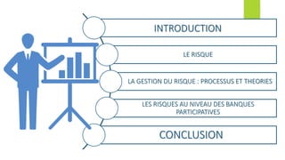 Ce document traite de la gestion des risques dans le contexte des banques, en définissant le risque, l'incertitude et les différentes approches pour évaluer et gérer les risques. Il souligne également les spécificités des risques aux banques participatives, notamment les risques liés aux opérations de financement et à la gestion des biens. Enfin, il conclut en soulignant l'importance d'une gestion efficace des risques pour la réussite et la pérennité des institutions bancaires.