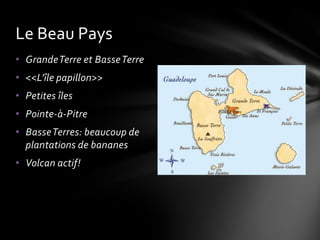 Le document présente la Guadeloupe, ses deux îles principales, Grande Terre et Basse Terre, ainsi que ses attractions touristiques comme le parc national, les chutes du Carbet et l'aquarium. Il mentionne également des éléments culturels tels que la cuisine créole, ainsi que des aspects de la production de sucre et de rhum. Enfin, un quiz est intégré pour tester les connaissances sur la géographie et les caractéristiques de l'île.