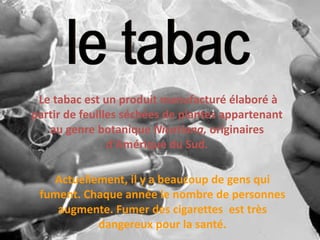 Le tabac, dérivé de feuilles de nicotiana, est la principale cause de mortalité évitable en France, responsable de 66 000 décès annuels et de 90 % des cancers du poumon. Le tabagisme passif cause également 3 000 à 5 000 morts parmi les non-fumeurs chaque année. Des lois anti-tabac ont été mises en place pour lutter contre ce fléau, bien que les opinions varient quant à leur efficacité.