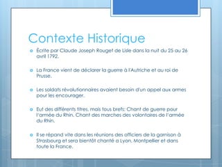 La Marseillaise, écrite par Claude Joseph Rouget de Lisle en 1792, est devenue un chant emblématique de la Révolution française et a été adoptée comme hymne national en 1879. Son statut a traversé de nombreuses périodes de censure et de réhabilitation, reflétant son importance historique et culturelle en France. Aujourd'hui, son apprentissage est obligatoire dans les écoles, soulignant son rôle continu dans l'identité nationale.