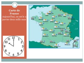Le rapport météorologique pour le 13 janvier 2011 en France indique des conditions partiellement nuageuses et des températures froides dans plusieurs villes. À Paris, la température est de 0°C, tandis qu'à La Rochelle, elle est de -2°C, et à Brest, le temps est décrit comme mauvais. Dans d'autres villes comme Aurillac et Nevers, les températures varient entre -6°C et 5°C.