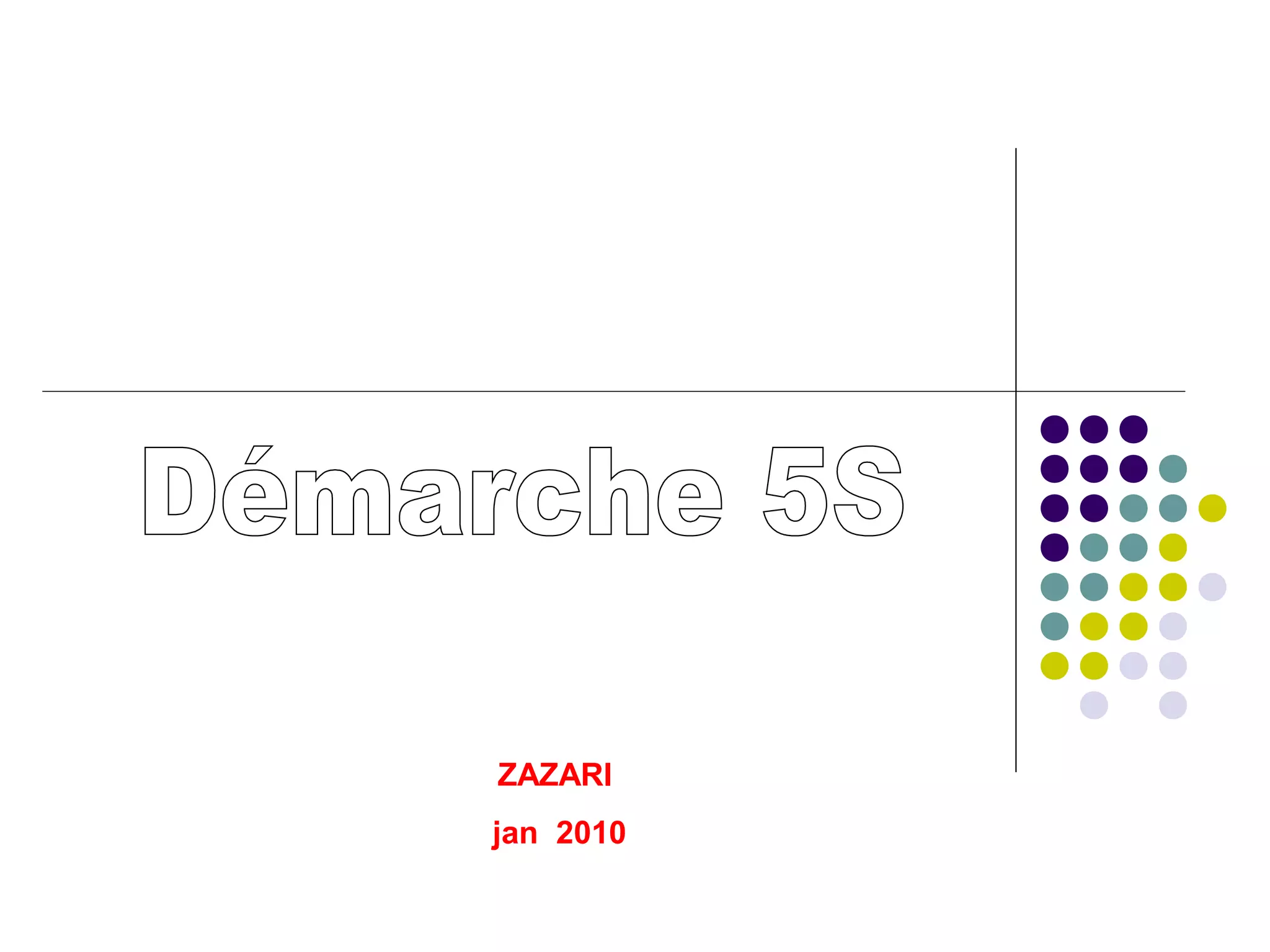 Le document traite de la méthode des 5S, une approche systématique visant à améliorer la productivité et la sécurité dans les entreprises en organisant l'espace de travail. Il présente les cinq étapes fondamentales : trier, ranger, nettoyer, standardiser et maintenir, ainsi que les objectifs et les clés de réussite pour leur mise en œuvre. La méthode favorise l'implication du personnel et l'engagement des dirigeants pour des résultats visibles et durables.