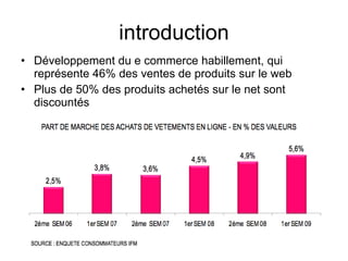 Le document traite du développement et de l'optimisation des sites de commerce électronique dans le secteur de la mode, en mettant l'accent sur des aspects tels que l'ergonomie, les méthodes d'analyse des utilisateurs et la mise en valeur des produits. Il présente également des statistiques sur l'augmentation du commerce en ligne et les comportements d'achat des consommateurs. Enfin, il aborde les stratégies de marketing digital telles que le SEO, le SEM, et l'importance de l'expérience utilisateur.