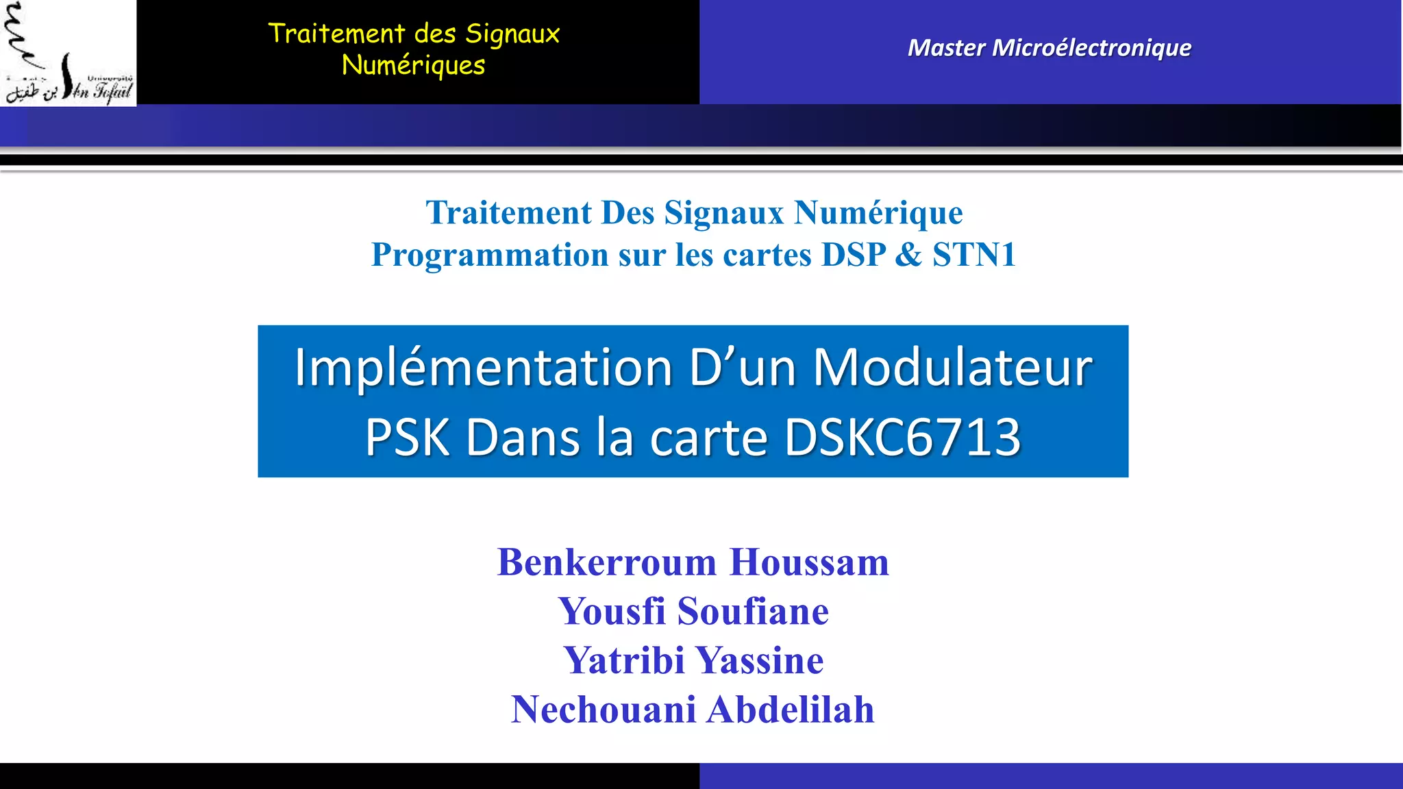 Le document traite de la modulation par déplacement de phase (PSK) dans le contexte du traitement des signaux numériques, expliquant ses principes, les types de modulation PSK et ses applications. Il aborde la théorie sous-jacente, les définitions clés et la mise en œuvre à travers des exemples, notamment le BPSK et le QPSK. La modulation PSK est illustrée comme un outil de transmission efficace, bien que sensible au bruit, et ses performances varient selon le nombre de symboles utilisés.