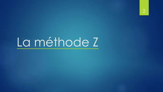 Le document présente la méthode Z, une méthode formelle utilisée pour la spécification des systèmes informatiques, développée par J.R. Abrial à l'Université d'Oxford dans les années 80. Il décrit la structure, la syntaxe, et les aspects statiques et dynamiques des spécifications en Z, ainsi que des exemples d'applications comme un dictionnaire de données et un système de gestion de dates d'anniversaire. Enfin, il aborde des concepts avancés comme le raffinement et l'extension vers Object-Z, montrant l'importance de cette méthode dans le domaine de l'informatique.