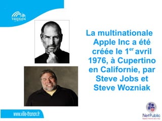 Apple Inc. a été fondée le 1er avril 1976 par Steve Jobs et Steve Wozniak à Cupertino, en Californie. La multinationale a connu un succès majeur avec des produits emblématiques tels que l'Apple II, l'iPod, l'iPhone et l'iPad, devenant un leader sur le marché de l'électronique. Tim Cook a pris la direction de l'entreprise après le départ de Steve Jobs en 1985, relançant les célèbres keynotes.