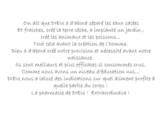 Le document explore l'idée que certains aliments ressemblent à des organes ou des parties du corps humain, suggérant que leur consommation peut bénéficier à la santé de ces organes. Par exemple, les carottes améliorent la vision, les tomates soutiennent la santé cardiaque, et les noix favorisent la fonction cérébrale. En outre, il souligne que divers aliments ont des propriétés curatives spécifiques et aident à équilibrer des fonctions corporelles essentielles.