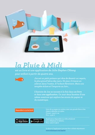 La pluie à midi est un projet innovant combinant un livre et une application pour enfants à partir de quatre ans, racontant l'histoire de Joe, un petit poisson cherchant son aileron à travers des aventures maritimes. Le livre de 44 pages, agrémenté d'illustrations, d'ailerons en papier détachables et d'interactions avec l'application, offre une approche hybride et ludique aux jeunes lecteurs. L'application propose des jeux interactifs ajustés à la météo et à l'heure locale, enrichissant ainsi l'expérience de lecture avec un monde aquatique dynamique.