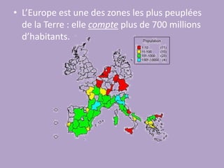 L'Europe est l'une des régions les plus densément peuplées, avec plus de 700 millions d'habitants, dont la majorité vit en milieu urbain. La population connaît un faible accroissement naturel en raison d'un nombre de naissances presque équivalent aux décès, et est de plus en plus vieillissante. L'immigration en provenance d'Afrique, d'Asie et d'Amérique du Sud contribue également à sa diversité démographique.