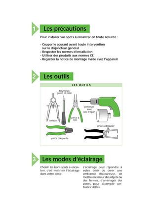Ce document propose des conseils pour installer des spots à encastrer, y compris les outils nécessaires et les précautions de sécurité à prendre. Il détaille également les types d'éclairage, la répartition des faisceaux lumineux, et les spécificités techniques comme le choix des transformateurs et la section des câbles. Enfin, il décrit les étapes d'installation pour les spots halogènes à basse tension et à incandescence.