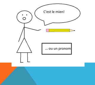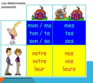 Le document présente des exercices sur les déterminants et pronoms possessifs adaptés pour des élèves de 6e année. Il inclut des quiz et des activités où les étudiants doivent remplacer des déterminants possessifs par des pronoms. Les exemples fournis aident à comprendre l'utilisation correcte des possessifs en français.