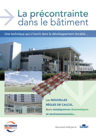 Le document traite de la précontrainte par post-tension dans le bâtiment, soulignant ses avantages économiques et environnementaux dans un contexte de développement durable. Il décrit l'évolution historique, les règles de calcul, ainsi que des exemples d'applications, tout en envisageant la réglementation et ses perspectives. La précontrainte est présentée comme une solution innovante pour optimiser les structures tout en réduisant les besoins en matériaux et les émissions de CO2.