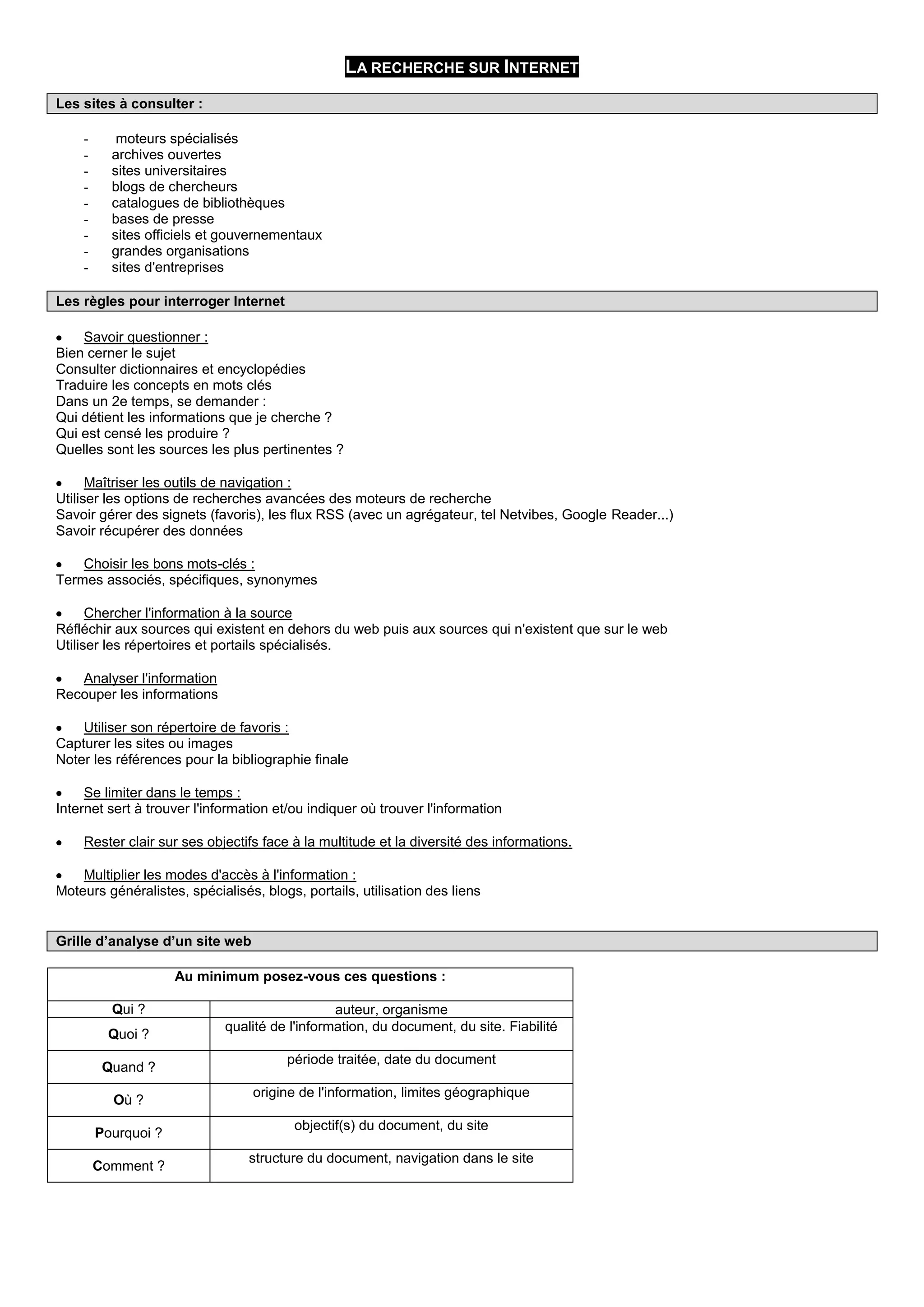 Le document fournit des directives sur la recherche d'information sur Internet, recommandant des sources variées telles que des moteurs spécialisés, des archives ouvertes et des sites universitaires. Il insiste sur l'importance de formulant des questions précises et d'utiliser des outils de navigation avancés pour optimiser les recherches. Il encourage également l'analyse critique des informations trouvées, en évaluant la fiabilité et la qualité des sources consultées.