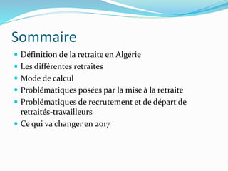 Le document traite du système de retraite en Algérie, définissant la retraite comme une rente viagère accessible sous certaines conditions d'âge et de période de travail. Il présente les différents régimes de retraite, le mode de calcul des pensions, ainsi que les conditions et problématiques liées à la mise à la retraite. Des changements prévus pour 2017 sont également abordés, soulignant les défis du rapport entre cotisants et retraités.
