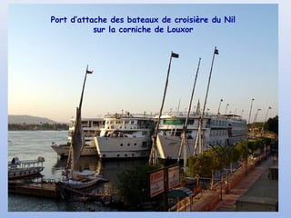 Le document relate une croisière de cinq jours sur le Nil, passant par des sites emblématiques tels que Louxor, Edfou, Kom Ombo, et Abou Simbel, tout en décrivant des temples anciens et leurs divinités. Il met en lumière les défis logistiques lors de la navigation, ainsi que la riche histoire et la beauté des lieux visités, incluant des références à des figures comme Agatha Christie. Le voyage se conclut par des images du coucher de soleil sur le Nil, illustrant la magie de l'expérience.