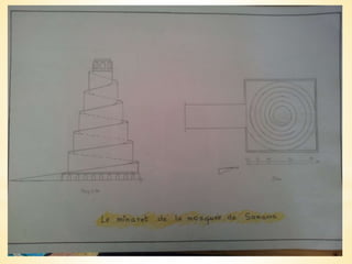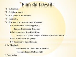 Le document présente une étude approfondie des minarets dans l'architecture islamique, leur histoire, leur structure, et leur signification symbolique. Il couvre les minarets des différentes dynasties, y compris les Omeyyades, les Abbassides et les Ottomans, ainsi que des exemples notables au Maghreb. La conclusion souligne la diversité des formes et matériaux des minarets à travers le temps et les régions, illustrant leur importance dans la culture musulmane.