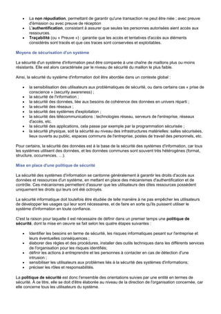 La sécurité des systèmes d'information (SSI) regroupe les moyens techniques et humains pour protéger les données et garantir l'intégrité, la confidentialité et la disponibilité d'un système d'information. Il est crucial de mettre en place une politique de sécurité, incluant l'identification des menaces, l'élaboration de règles, et la sensibilisation des utilisateurs, ainsi que des contre-mesures techniques adaptées. Différentes méthodes d'analyse des risques, comme EBIOS et MEHARI, permettent d'évaluer et de traiter les vulnérabilités potentielles dans un contexte global.