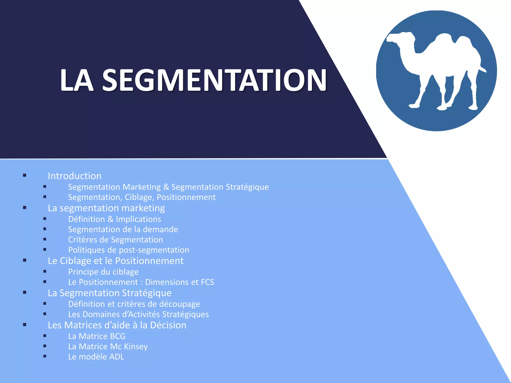 Le document traite de la segmentation marketing et stratégique, expliquant l'importance de diviser un marché en sous-ensembles homogènes pour mieux cibler et positionner une offre. Il aborde également les critères de segmentation, les politiques post-segmentation et les démarches à suivre pour une stratégie marketing efficace. Enfin, il met en lumière les outils d'aide à la décision tels que les matrices BCG et McKinsey.