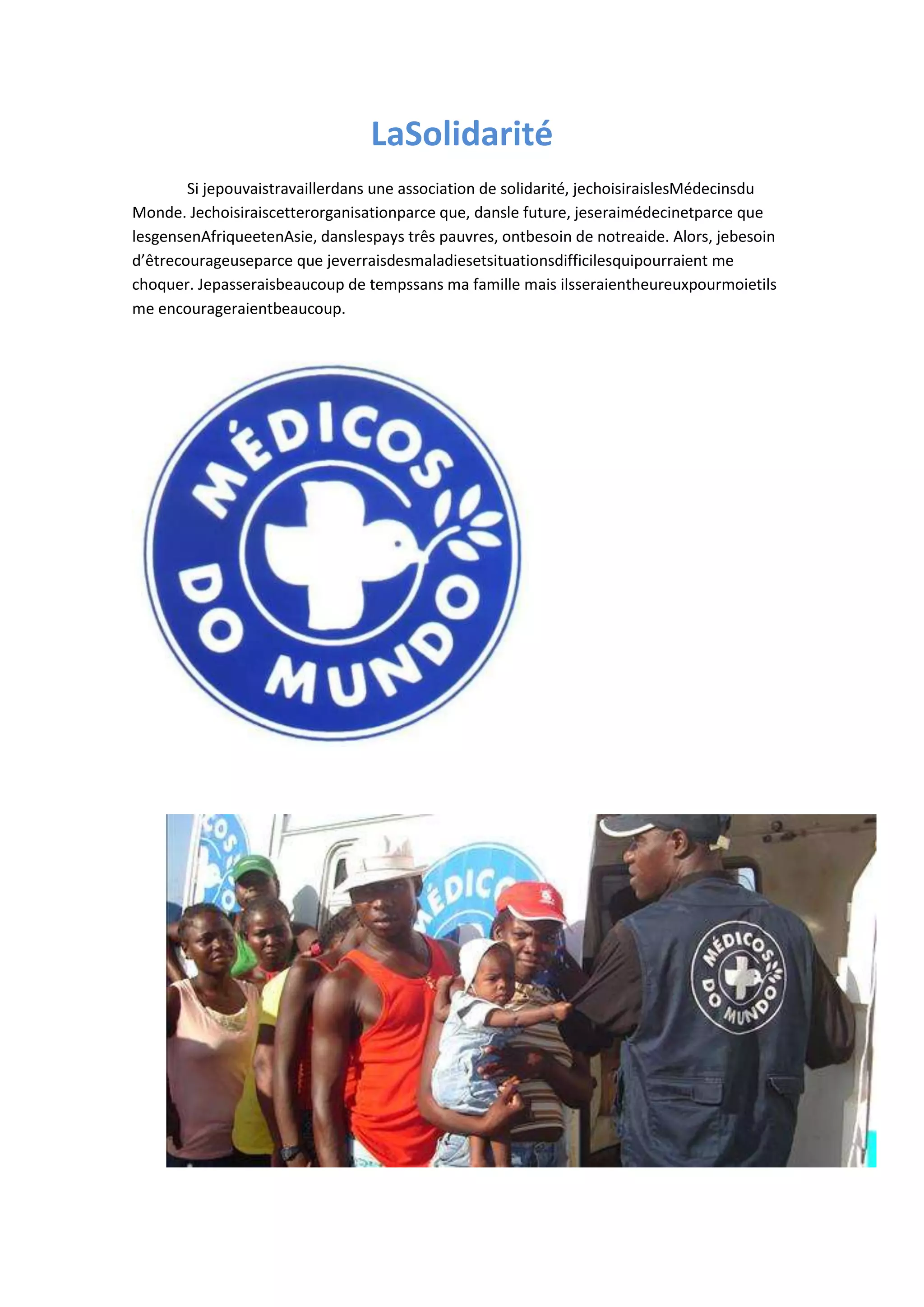 L'auteur exprime son désir de travailler avec l'organisation Médecins du Monde, soulignant la nécessité d'aide pour les pays pauvres en Afrique et en Asie. Il reconnaît que ce travail serait difficile et pourrait être choquant, mais se sent motivé et soutenu par sa famille. L'engagement dans cette mission de solidarité est au cœur de ses aspirations professionnelles futures.