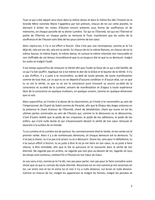 Le document invite à la reconnexion avec sa vérité intérieure et à la célébration de l'amour inconditionnel, indépendamment des souffrances et illusions de ce monde. Il énonce que la liberation et l'ascension spirituelle sont possibles en embrassant l'éternité, en écoutant son cœur et en se libérant des croyances limitantes. En définitive, il encourage à redécouvrir son essence divine et à vivre dans la joie et l'unité.