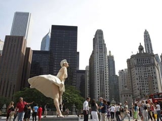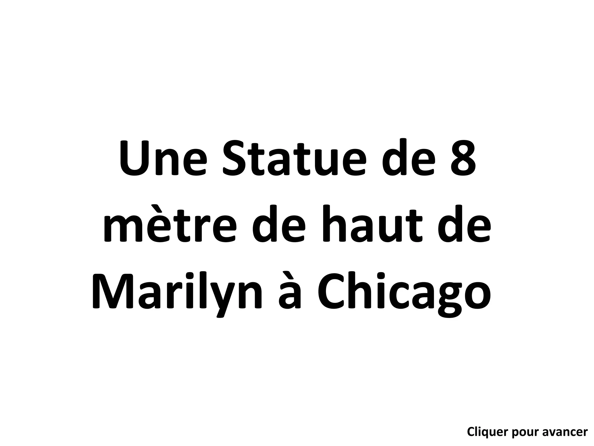 Une statue de 8 mètres de Marilyn Monroe à Chicago attire l'attention des visiteurs. L'œuvre, qui mesure 25 pieds, est présentée comme une attraction mémorable et bien entretenue. Les gens sont encouragés à l'admirer, qu'il pleuve ou qu'il fasse beau.