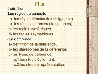 Le document analyse les concepts de tenue et de déférence en sociologie, en se basant principalement sur les travaux d'Erving Goffman. Il discute des règles de conduite, de la définition et des types de déférence, ainsi que de l'importance de la tenue dans l'interaction sociale, reliant ces notions à des contextes de comportement et de statut social. En conclusion, la tenue et la déférence sont présentées comme des éléments complémentaires régis par des règles sociales qui influencent notre perception de l'image et des attentes des autres.