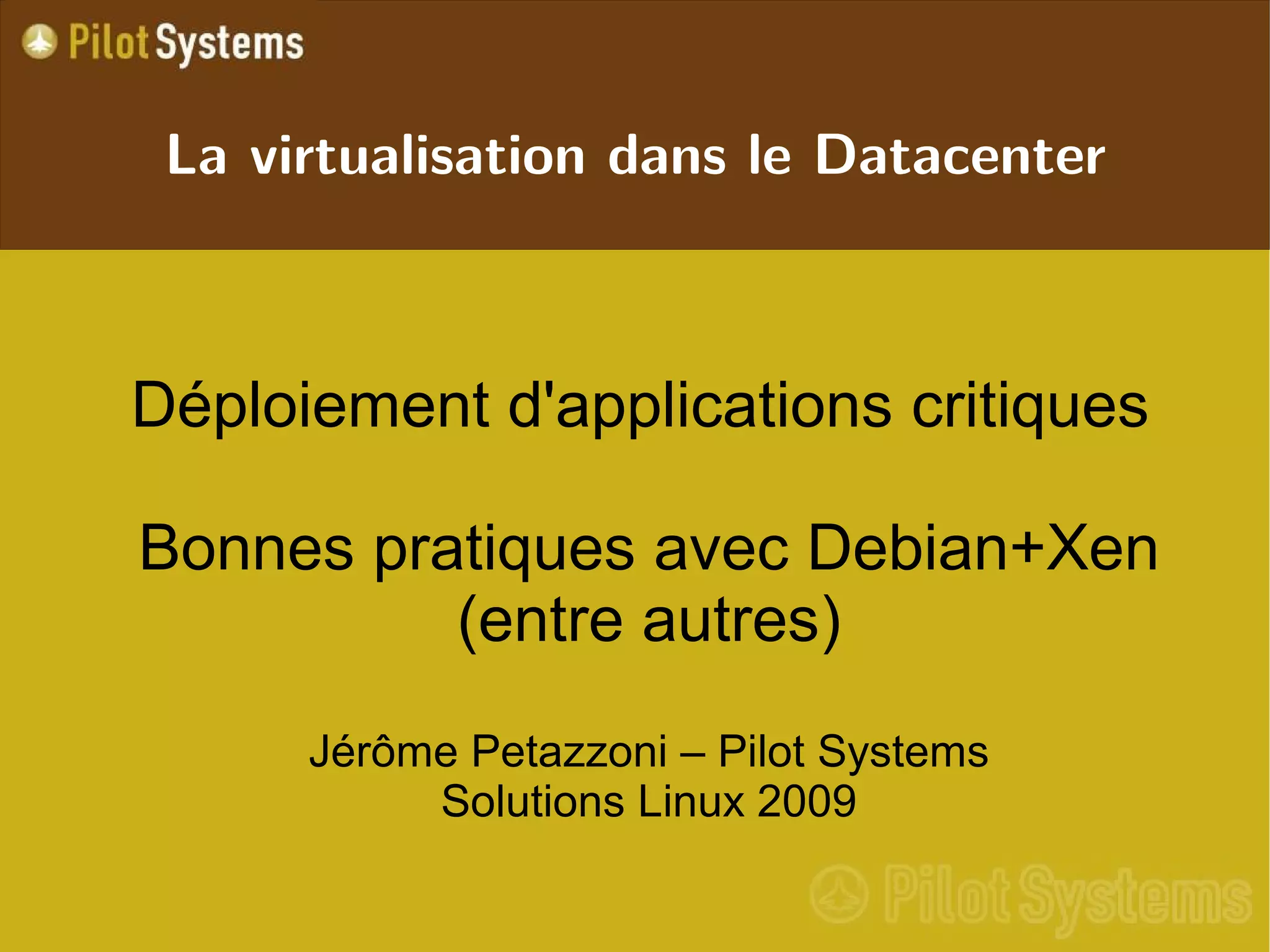 Le document présente les bonnes pratiques pour la virtualisation dans un datacenter utilisant Debian et Xen, en se concentrant sur des applications critiques. Il aborde des sujets tels que la sécurité, la connectivité réseau, le stockage de données, et la haute disponibilité, tout en fournissant des détails techniques sur l'installation et la configuration. L'auteur s'adresse à divers publics, notamment les décideurs et les administrateurs systèmes, en démontrant l'intérêt de la virtualisation pour réduire les coûts et améliorer la rentabilité des serveurs.