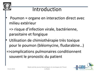 Le document traite des complications pulmonaires chez les patients hématologiques, mettant en évidence l'importance des infections telles que l'aspergillose et la tuberculose dans le pronostic post-greffe. Il présente également des cas cliniques illustrant divers défis diagnostiques et thérapeutiques, ainsi que l'importance des prophylaxies adaptées. Des recommandations pour le traitement et la surveillance de ces infections chez des patients immunodéprimés sont fournies.