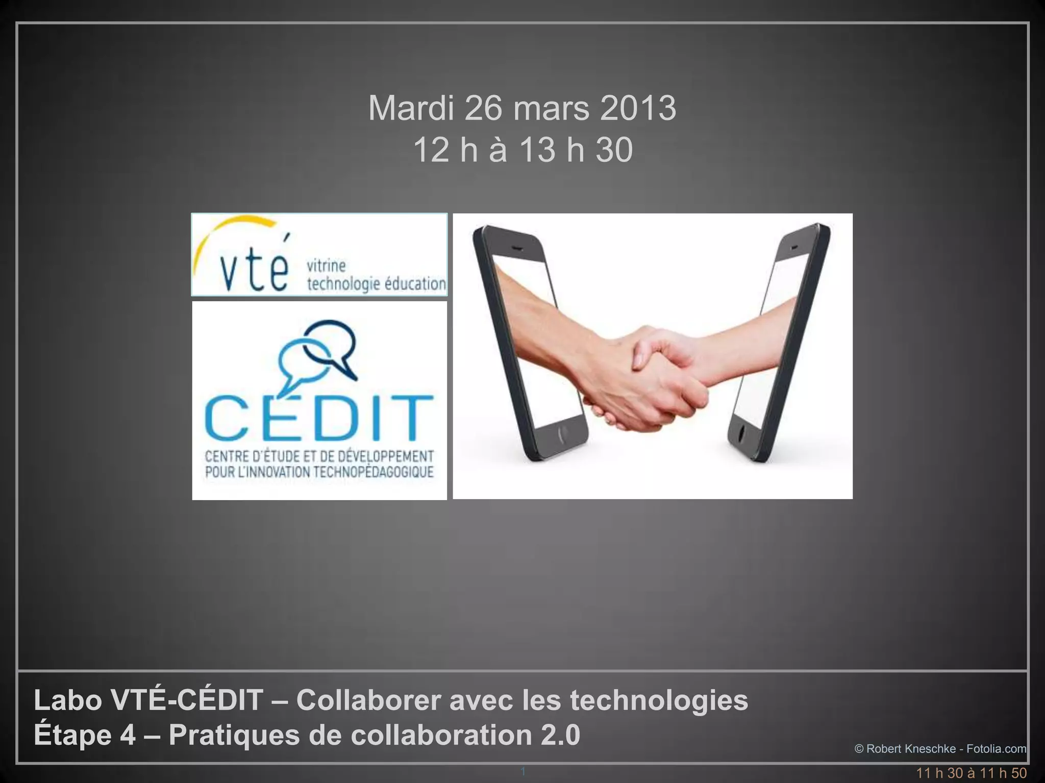 Le document détaille les procédures pour une rencontre en ligne axée sur les pratiques de collaboration 2.0, incluant l'activation du micro et de la caméra, ainsi que l'interaction via le clavardage en cas de problèmes techniques. Les participants sont guidés à travers des activités de travail en sous-groupes pour co-construire un outil sur les bonnes pratiques. Il se termine par une évaluation du laboratoire et un remerciement aux participants.