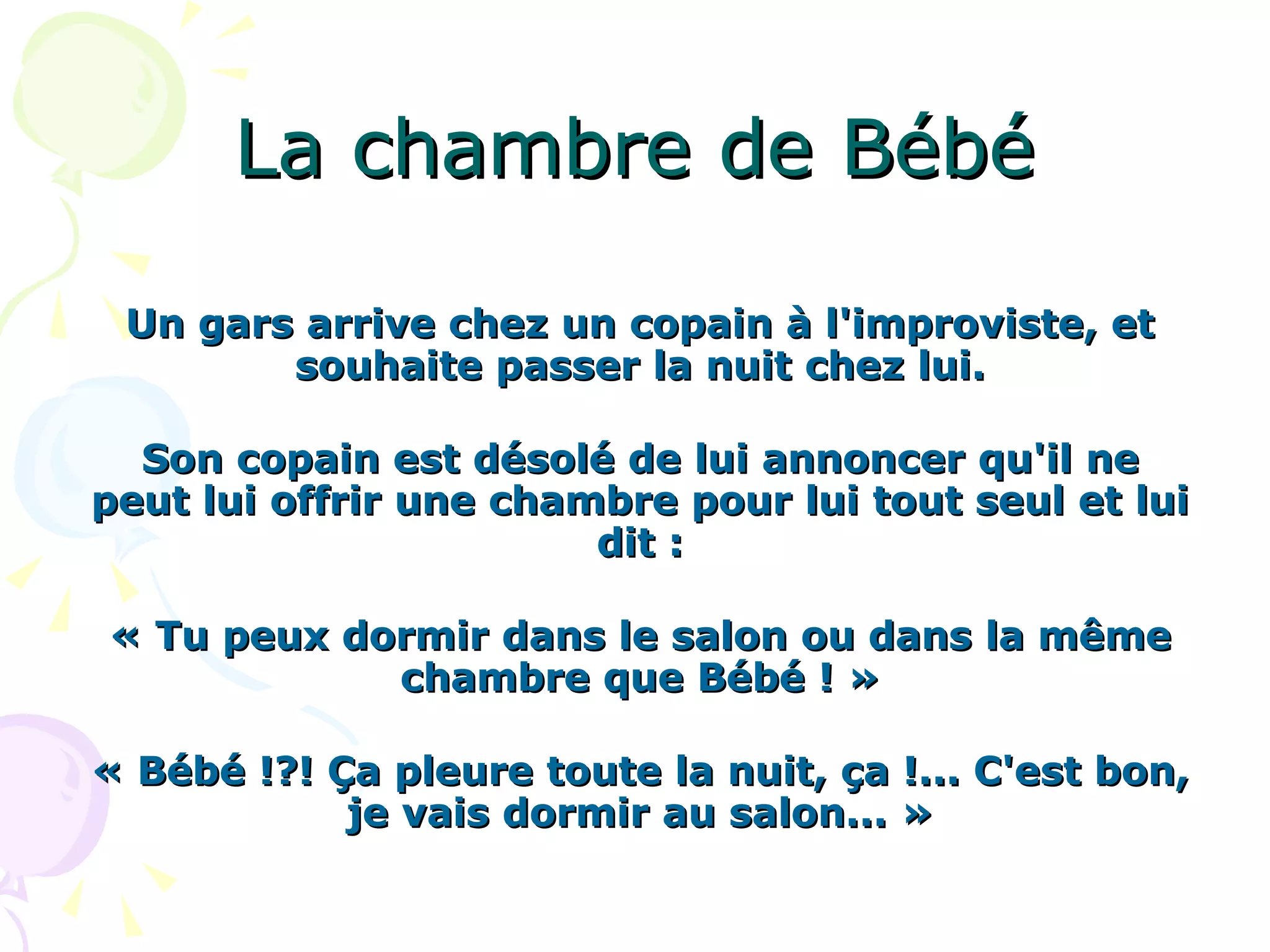 Un homme arrive chez un ami pour passer la nuit, mais celui-ci ne peut pas lui offrir une chambre. Il décide de dormir dans le salon plutôt que dans la chambre avec un bébé qui pleure. Le lendemain, il rencontre une jeune femme qui s'appelle Béatrice, mais il la surnomme 'bébé'.