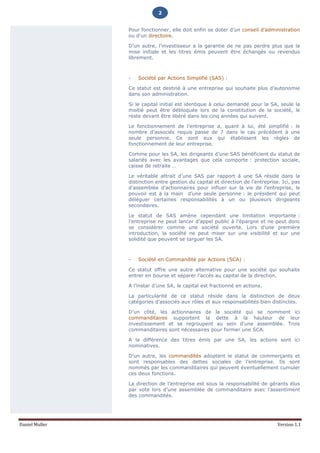 Le document traite des différentes structures juridiques d'entreprises qui peuvent accéder à la bourse, telles que la société anonyme, la société par actions simplifiée et la société en commandite par actions. Chaque forme présente des caractéristiques uniques concernant la responsabilité des actionnaires, les exigences de capital et la gestion. Il explique aussi comment la valeur des actions est déterminée et l'importance des bénéfices pour les actionnaires.