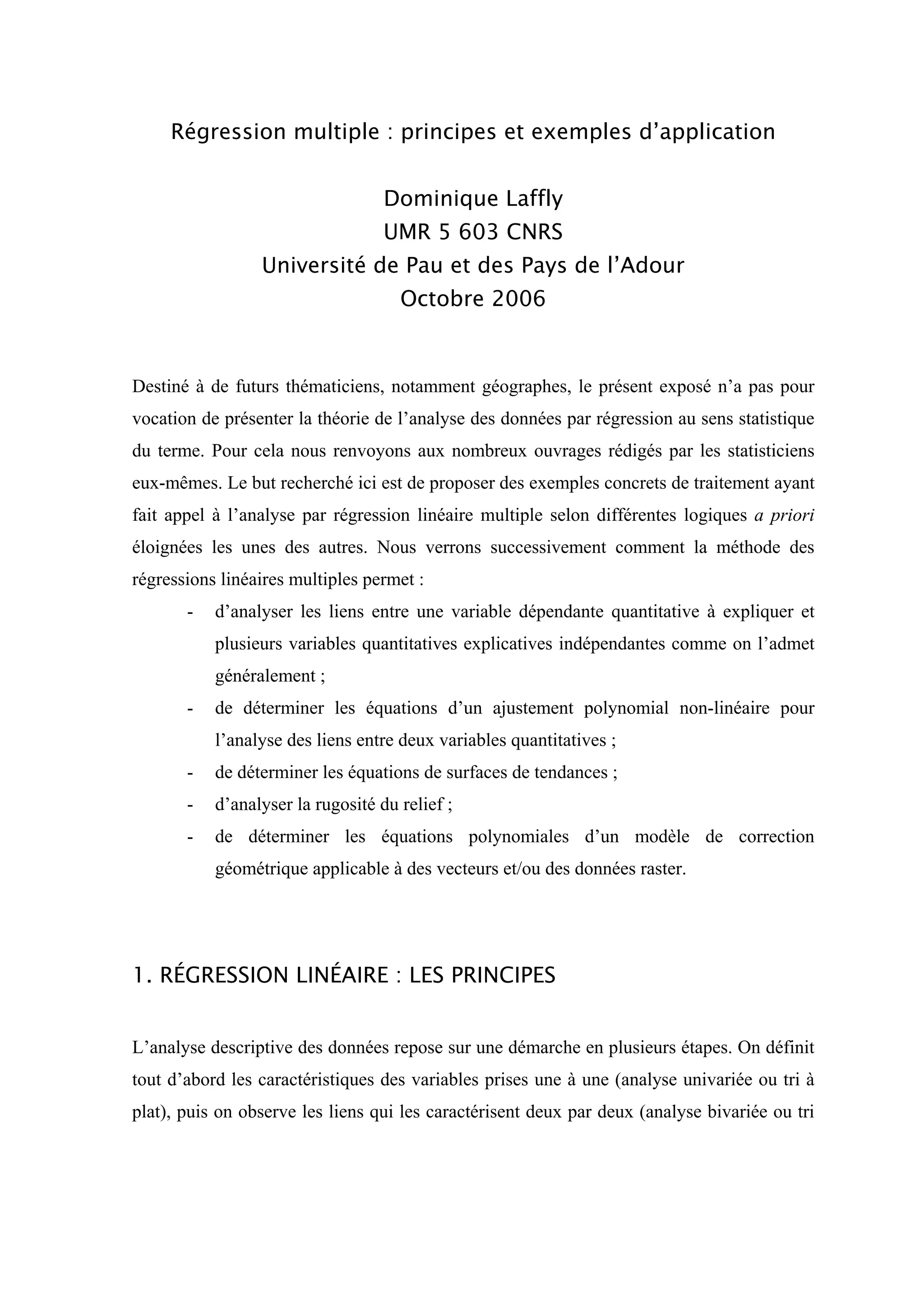 Le document présente les principes de la régression linéaire multiple et fournit des exemples d'application, notamment pour analyser les relations entre variables quantitatives. Il explicite les étapes de calcul, la résolution d'équations et l'analyse des résidus, ainsi que l'utilisation de la matrice pour la régression. L'accent est mis sur l'exemple de l'analyse de la hauteur de neige en fonction de diverses variables environnementales.