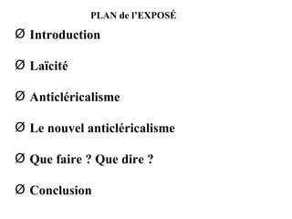 Le document traite de la tension entre la foi chrétienne et la laïcité dans une société contemporaine, examinant le concept d'anticléricalisme et le nouvel anticléricalisme. Il souligne la nécessité d'engager un dialogue constructif et d'agir concrètement face à l'inculture croissante et aux préjugés envers les religions. La conclusion appelle à une prise de conscience et à une action éclairée pour éviter le repli identitaire et les mythes d'un passé idéalisé.