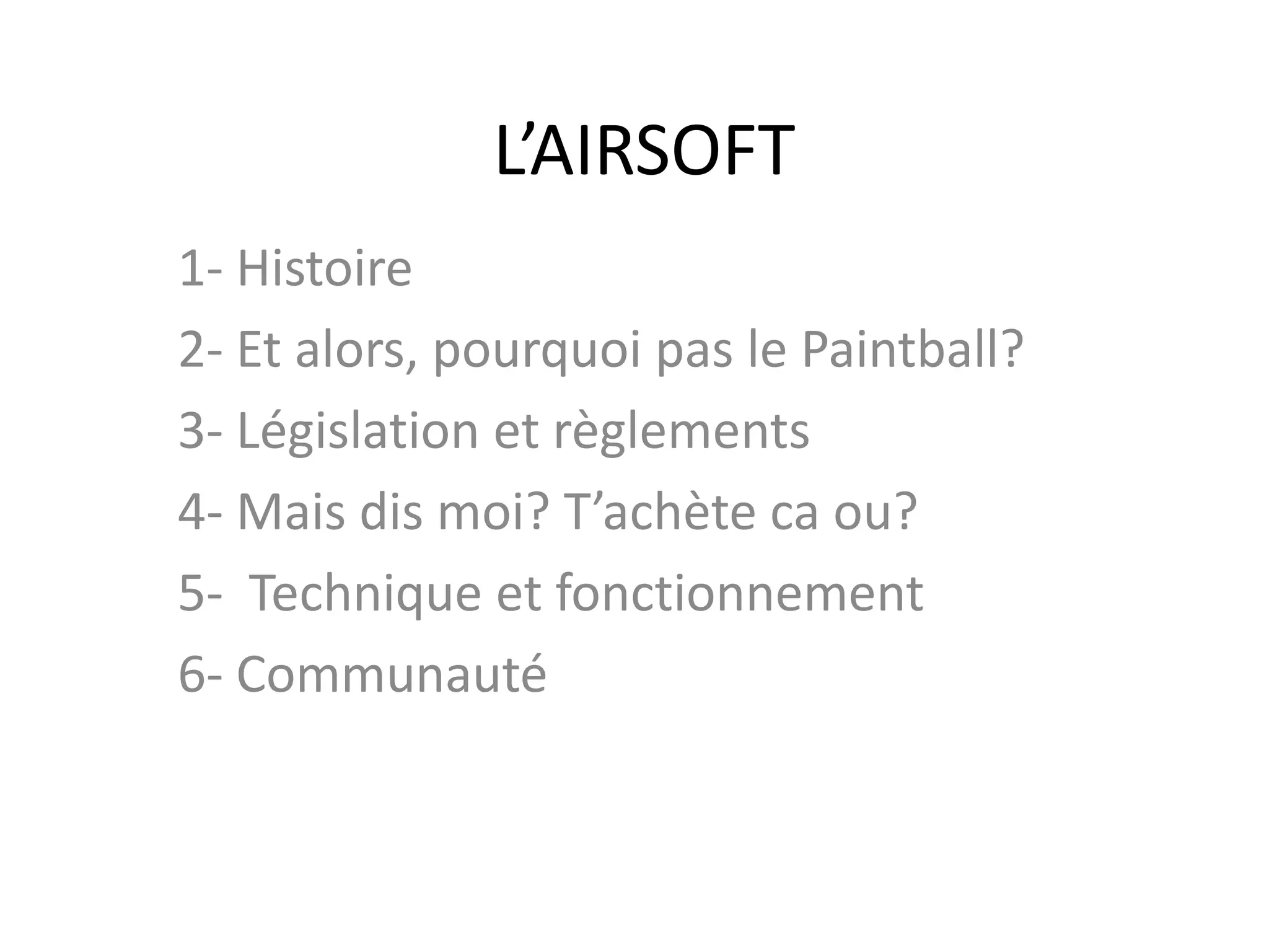 L'airsoft est un loisir né au Japon après la Seconde Guerre mondiale, offrant une pratique différente du paintball, basée sur des répliques d'armes sans projectiles létaux. La discipline est encadrée par des règlements, exigeant que les utilisateurs soient majeurs et que les répliques ne dépassent pas une puissance de 2 joules, permettant ainsi une pratique sécurisée sur des terrains privés. L'évolution technologique des répliques, dont les AEG et GBB, a contribué à la popularisation de l'airsoft, qui attire aussi des passionnés pour le côté reconstitution et accessoirisation de leurs équipements.