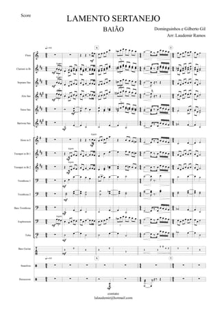 Le document contient des arrangements musicaux, notamment le 'lamento sertanejo', composé par Dominguinhos et Gilberto Gil. Il indique également les instruments impliqués dans la performance, tels que des flûtes, des saxophones et divers cuivres. Des indications de jeu comme 'legato' et 'marcato' sont présentes à travers la notation musicale.