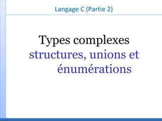 Le document présente des concepts avancés du langage C, notamment les structures, unions et énumérations. Il détaille la définition, la déclaration, l'initialisation et l'accès aux champs des structures, ainsi que l'utilisation des typedefs pour simplifier la gestion des types. De plus, il propose des exercices pratiques pour modéliser des nombres complexes et gérer les notes d'une classe d'étudiants.