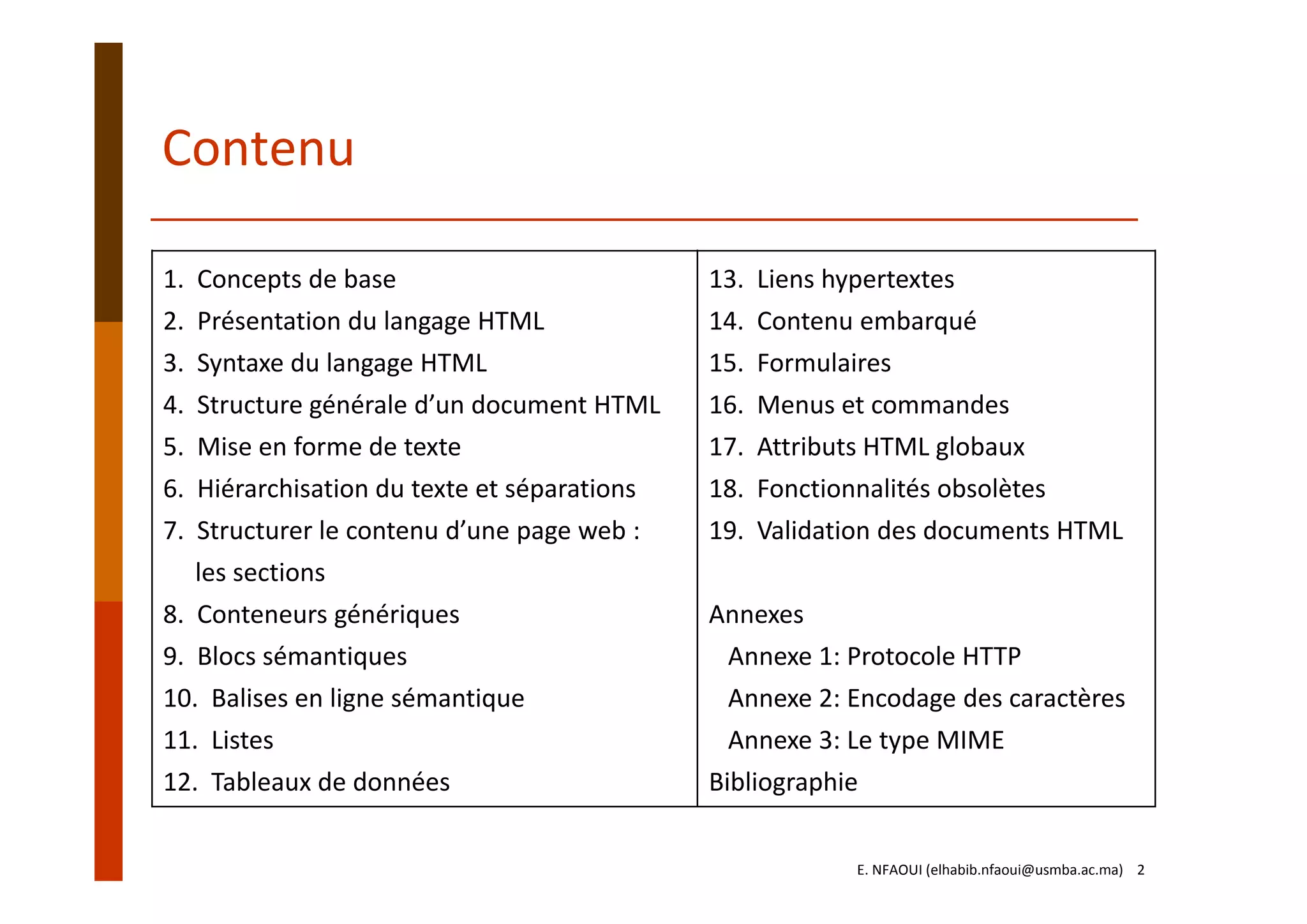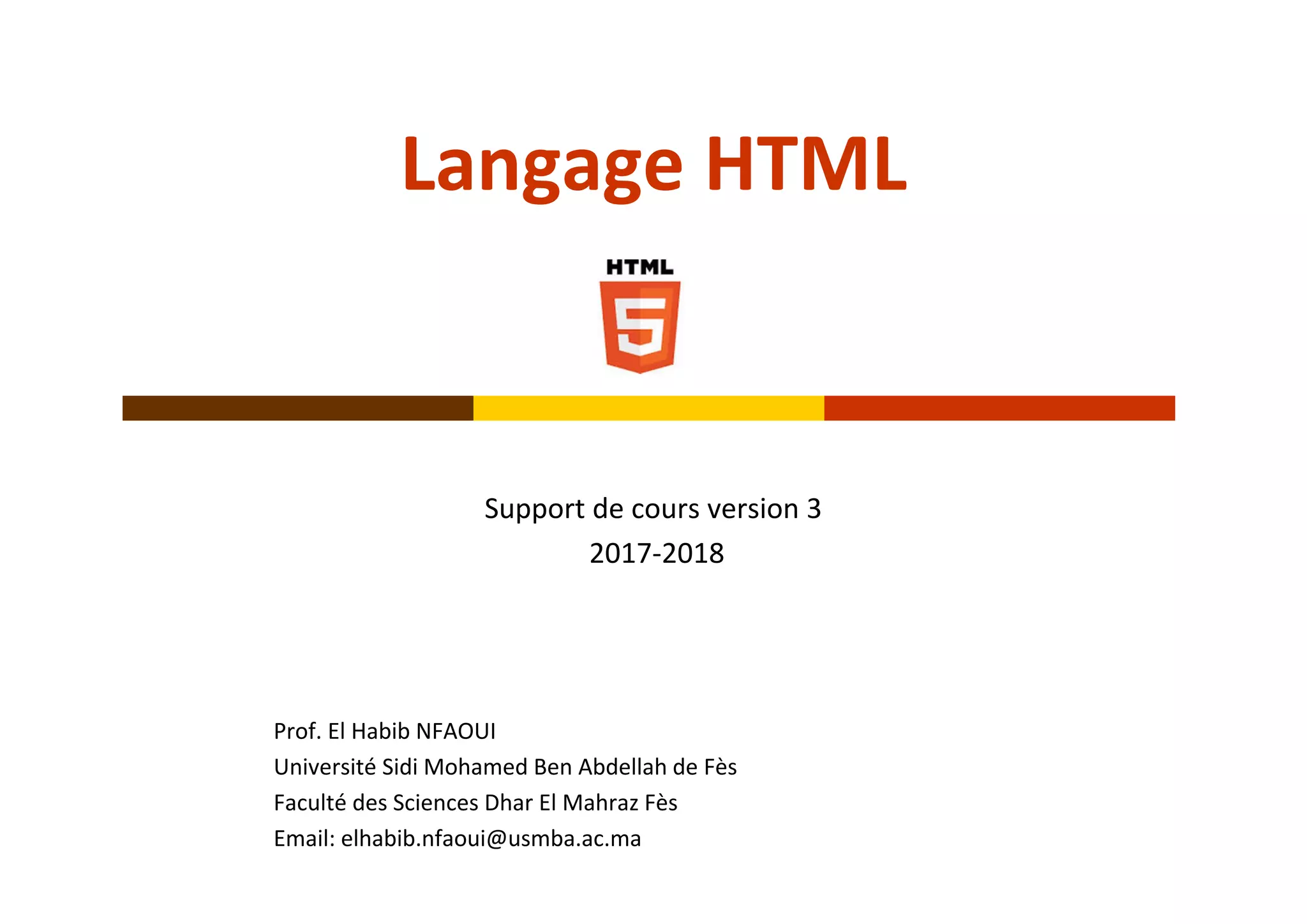 Ce document est un support de cours sur le langage HTML, présentant ses concepts fondamentaux, sa syntaxe, et les éléments nécessaires à la création d'une page web. Il aborde l'architecture client-serveur et fournit des détails sur les balises HTML, leur utilisation, et les bonnes pratiques. L'évolution du langage HTML est également discutée, notamment l'importance de la version HTML5 et des langages associés comme CSS et JavaScript.