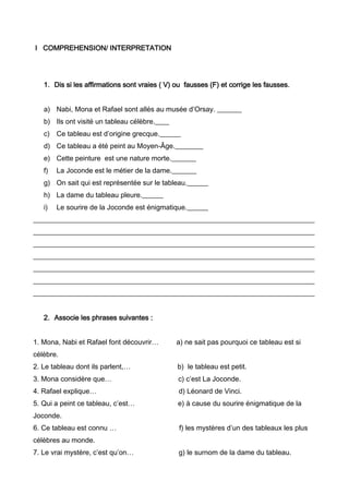 Le document traite de la Joconde, le tableau emblématique présenté par Rafael, Mona et Nabi. Ils discutent de son créateur, Léonard de Vinci, et de son célèbre sourire énigmatique, qui contribue à sa renommée. Les personnages s'interrogent également sur la célébrité du tableau et la raison pour laquelle il attire tant de visiteurs.